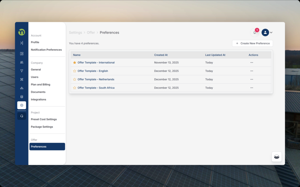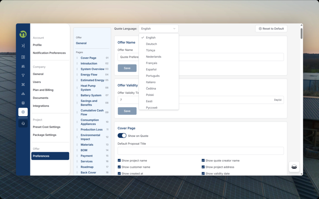 Proposal Preference Locale: Create and save multiple proposal preference sets in any language you need. Each set can be fully customized, including template layout, content blocks, language, units and currency formatting. Switch between regions or customer types instantly and generate proposals tailored to the exact locale.