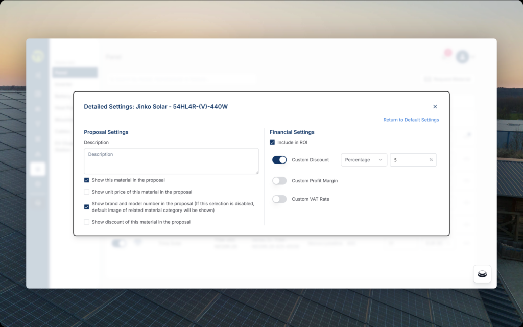 Detailed Information Entry in BoM: Decide exactly which financial details appear in your proposals. In the Bill of Materials, you can choose for each active material whether to show or hide its information, unit price, VAT, discount rate, item level discounts or other related components, giving you full control over what customers see.