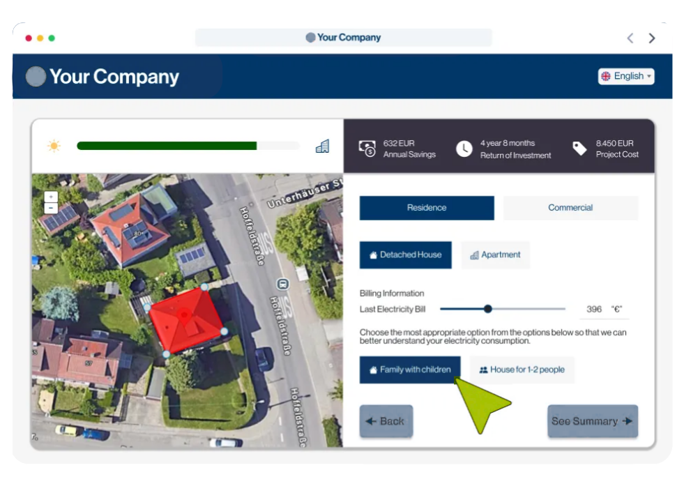 Enhance your lead generation process by providing instant feasibility insights and preliminary proposals based on project location and your own product selections.