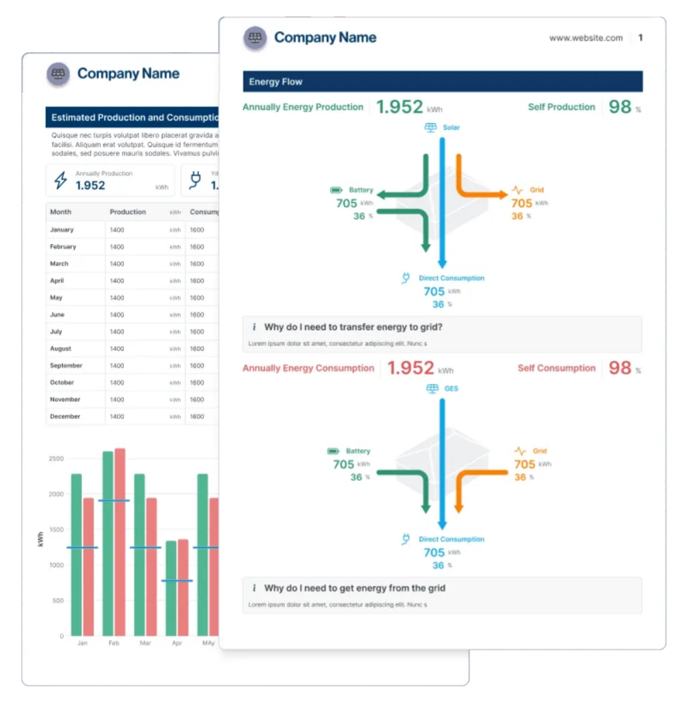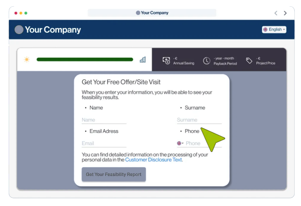 Users receive a customized, bankable and signable pre-feasibility report and proposal with your branding. By converting them into leads, you not only improve conversion rates but also differentiate your business by offering added value and a seamless user experience.